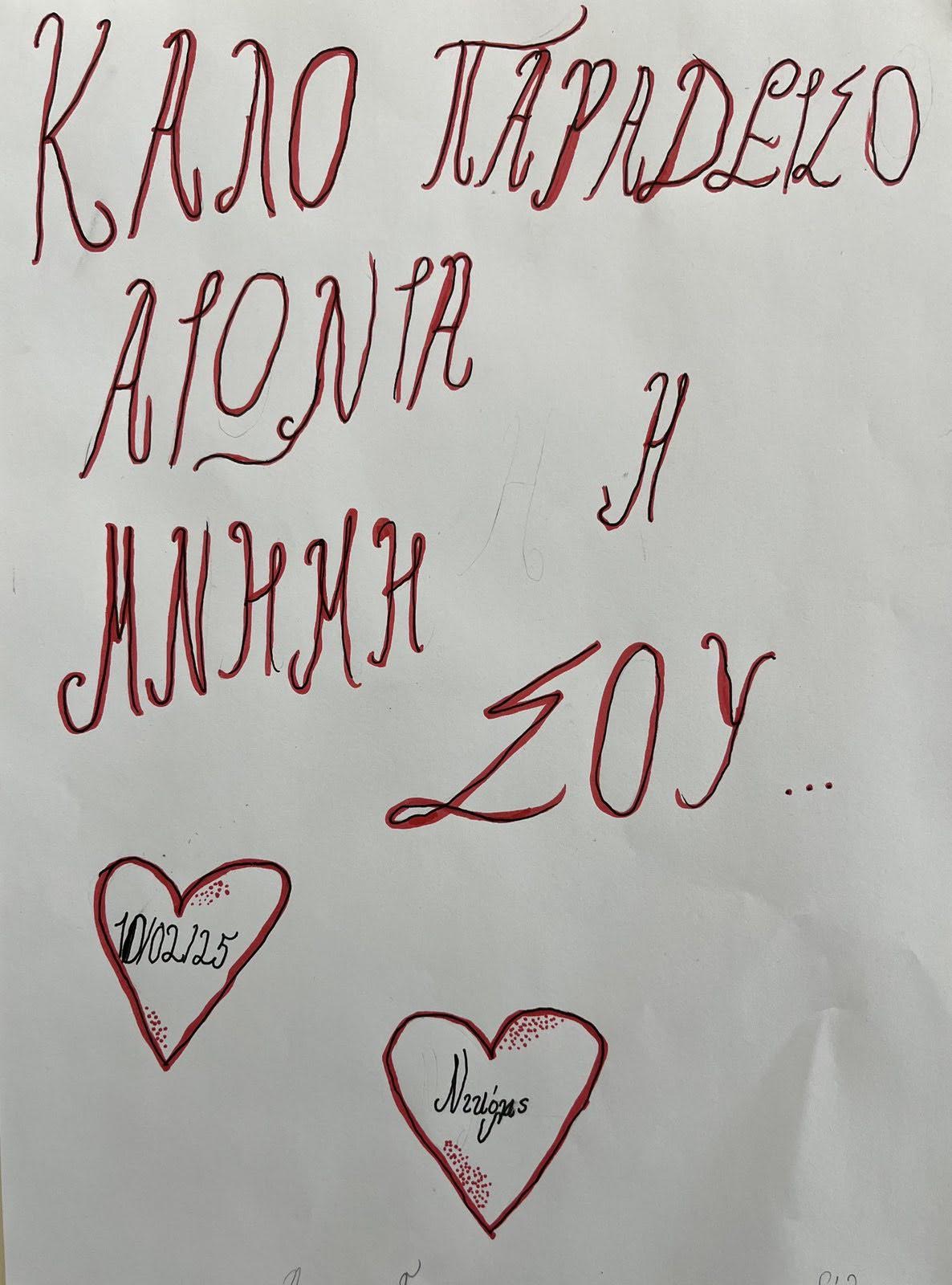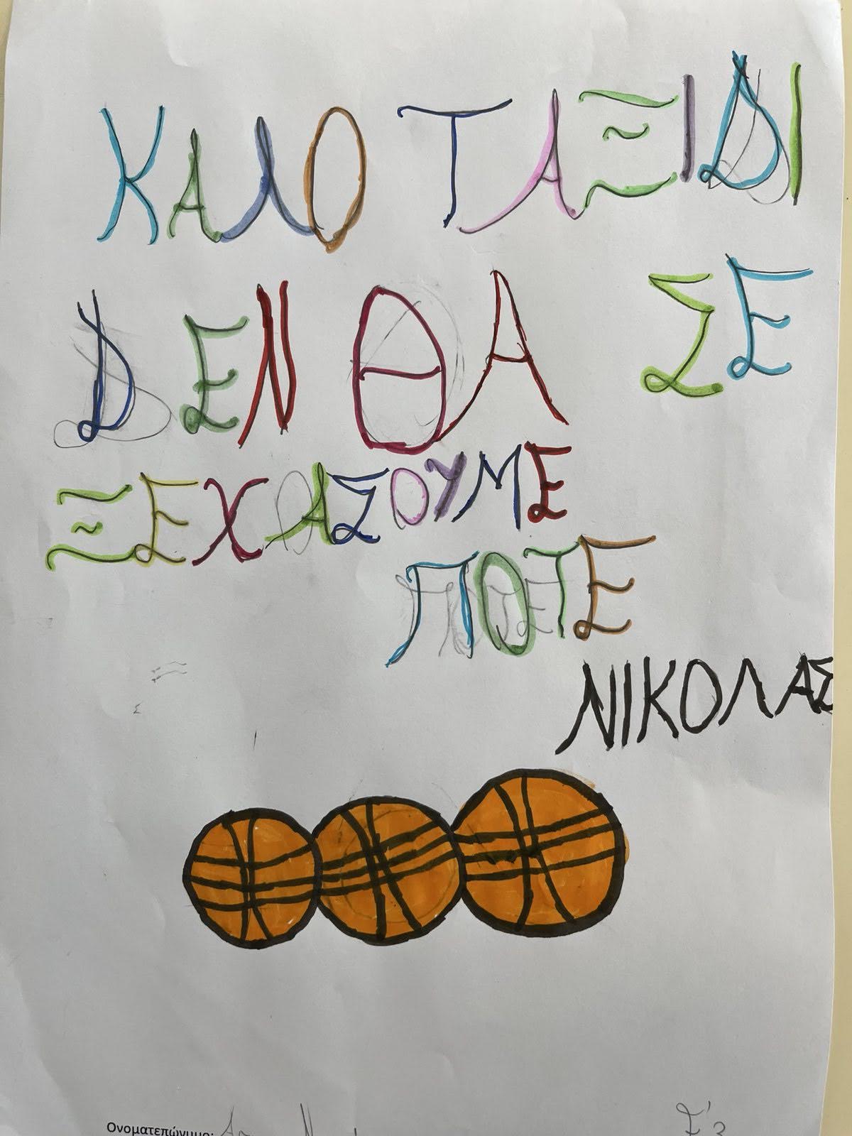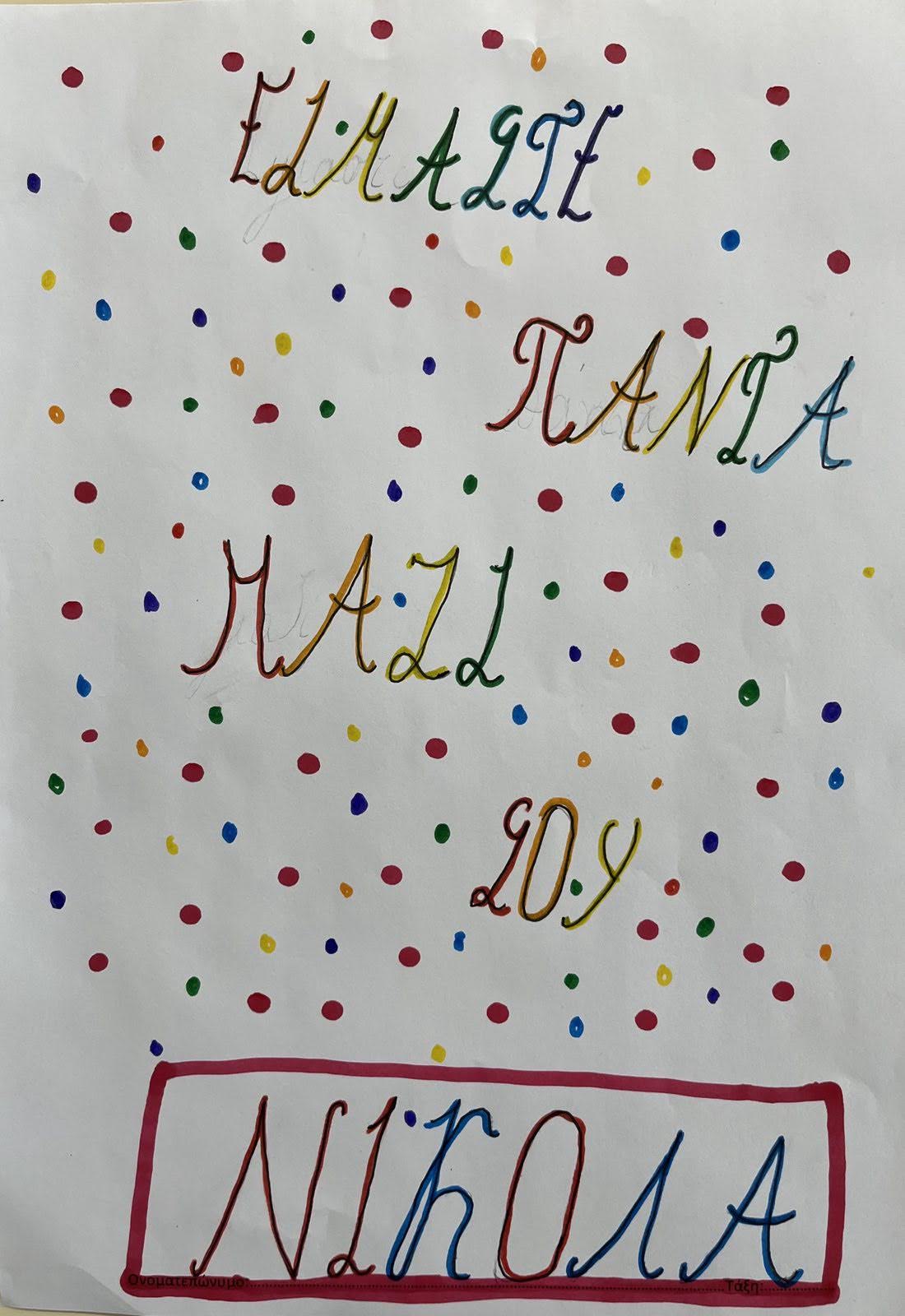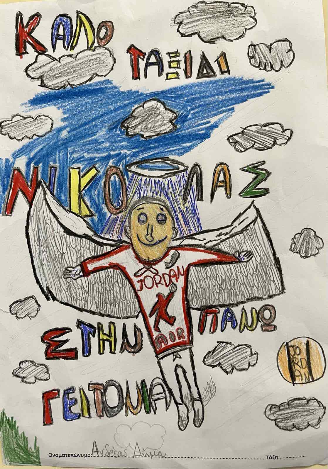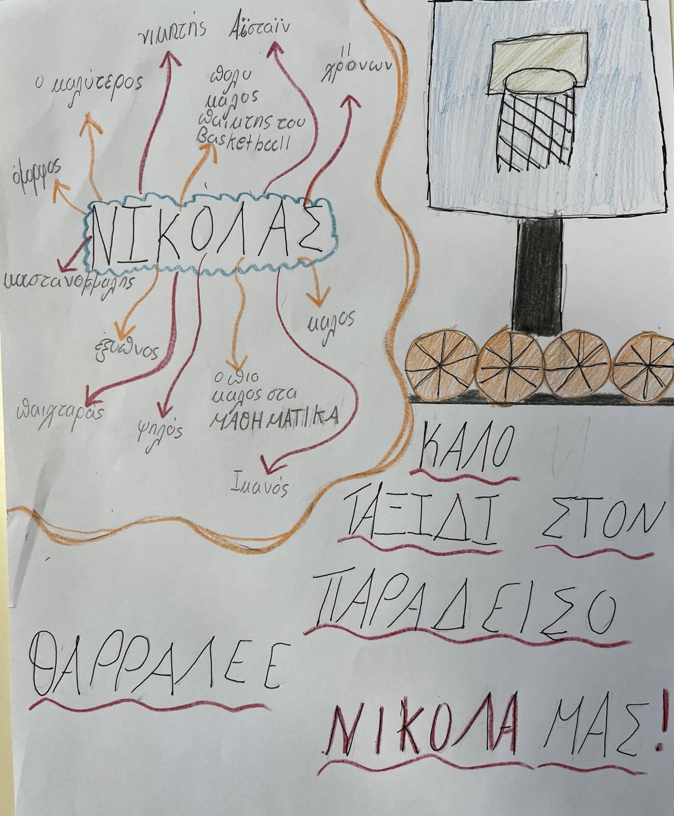 Με ανείπωτη θλίψη και πόνο στην καρδιά αποχαιρετήσαμε στις 13 Φεβρουαρίου τον μαθητή μας Νικόλα Τζάμιτς, ένα παιδί που φώτιζε τη ζωή των συμμαθητών του με το χαμόγελό του, τη ζωντάνια του, το ταλέντο του. Την επομένη της κηδείας φέραμε drone στο σχολείο και φωτογραφίσαμε τα παιδιά που σχημάτισαν το όνομα του Νικόλα. Επίσης δημοσιεύουμε και εργασίες που έκαναν οι συμμαθητές του εντελώς αυθόρμητα. Νικόλα μας, η αγάπη που σκόρπισες, η έμπνευση που έδωσες σε συμμαθητές και δασκάλους, θα ζουν για πάντα μέσα μας. Αιωνία να είναι η μνήμη σου και ας είναι ελαφρύ το χώμα που θα σε σκεπάσει.